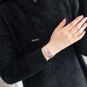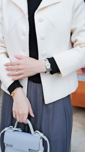 文字盤は落ち着いたピンクのため、光によってシルバーピンクやオレンジピンクに手元で輝いてくれます。ブレスレットのピンクはイエローより肌馴染み良くさりげなくコンビをお楽しみいただけます。