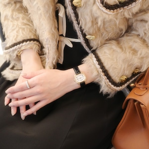 見た目は素朴なデザインも腕元にはめると丸型のスクエアが気品あふれるシルエット。